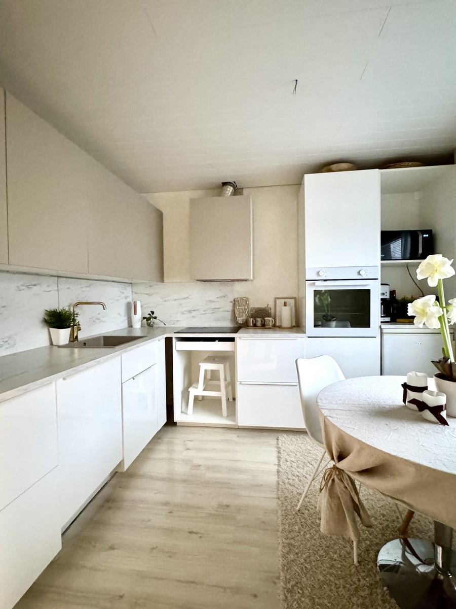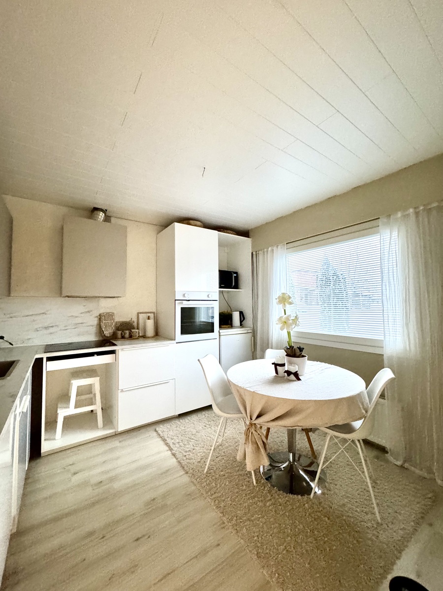 | Kuvaus | Keittiö remontoitu v. 2021, uusittu kaapistot ja keittiön koneet sekä pintaremontoitu kaikki pinnat. Keittiön lattia laminaattia, seinät maalattu. Varusteena astianpesukone, induktioliesi, erillisuuni, jääkaappi/pakastin, liesituuletin. |