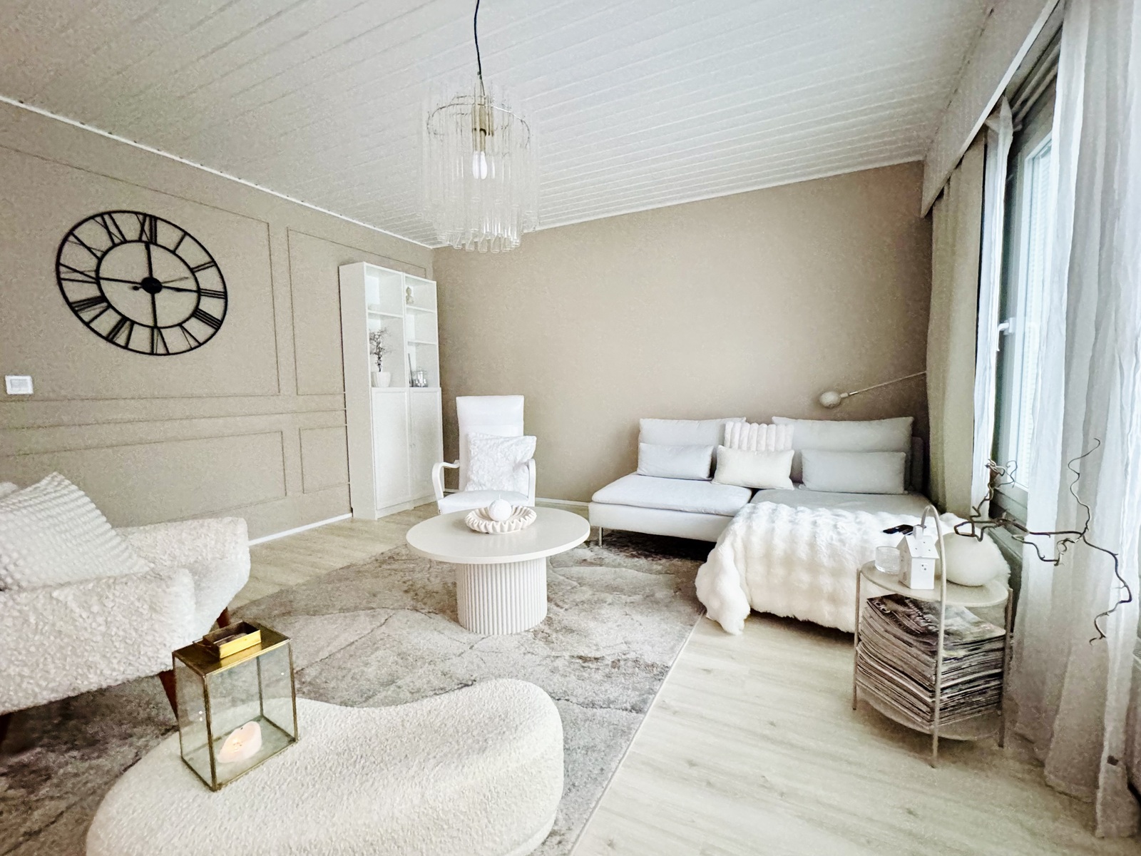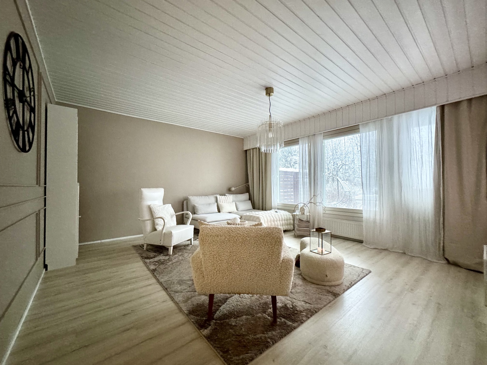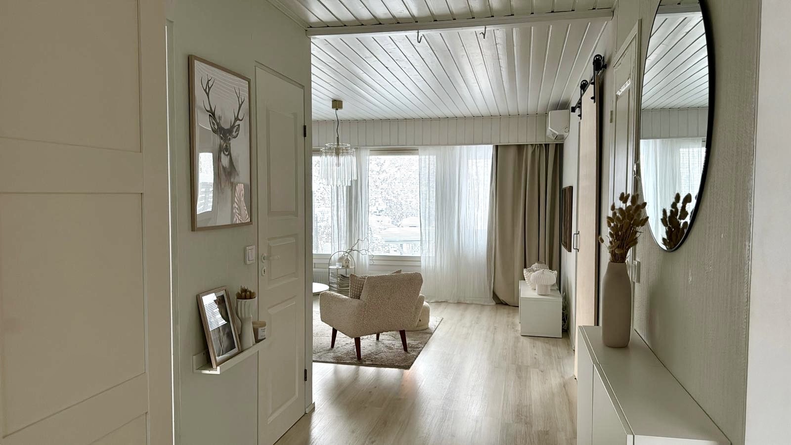 | Kuvaus | Avara ja valoisa olohuone, josta näkymä isoista uusituista ikkunoista takapihan puutarhaan. Olohuoneesta käynti takapihalle. Seinät maalattu, lattia laminaattia. Olohuoneen ja makuuhuoneen välissä persoonallinen "ladonovi", joka on myös sisustuselementtinä. |