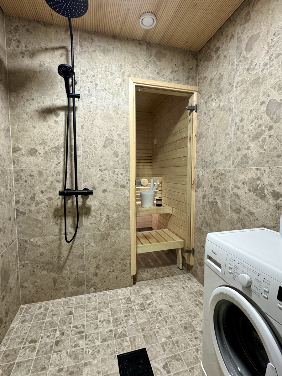 | Kuvaus | Kylpyhuone remontoitu perusteellisesti v. 2025; kaikki vanhat materiaalit poistettu, vesieristetty, laatoitettu. Modernit isot seinälaatat. Varusteena suihku, pyykinpesukoneliitäntä, lattialämmitys. |