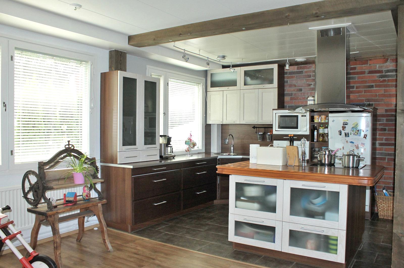 | Kuvaus | Avoin keittiö olohuoneen yhteydessä Seinäpinnat osin maalattu, osin tapetoitu, osin tiiliseinää, lattia laatoitettu. Varustus; jääkaappi (2022), keraaminen liesi, liesituuletin, astianpesukone (2022). Keittiö remontoitu v. 2006, Puustellin kaapistot. Kaapistoja ja uusi liesituuletin huippuimurilla asennettu v. 2012. |