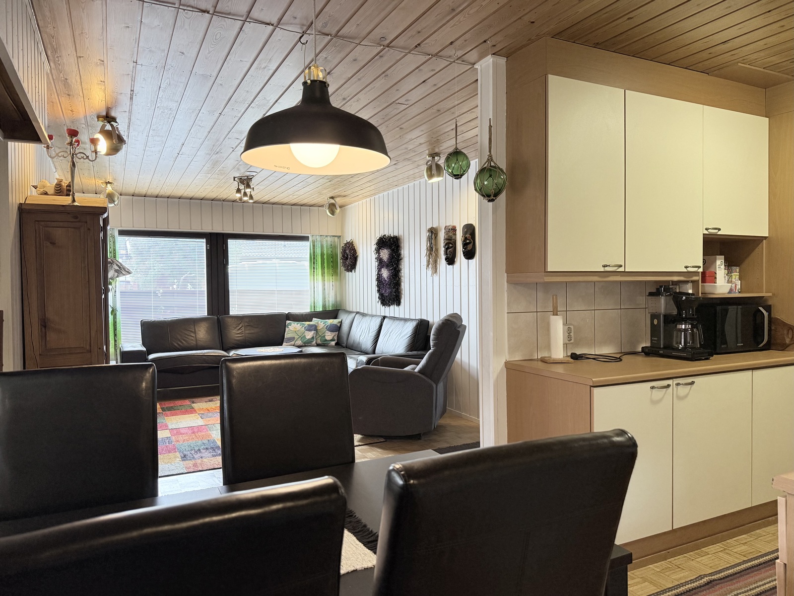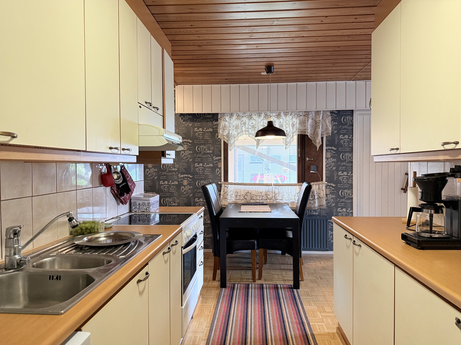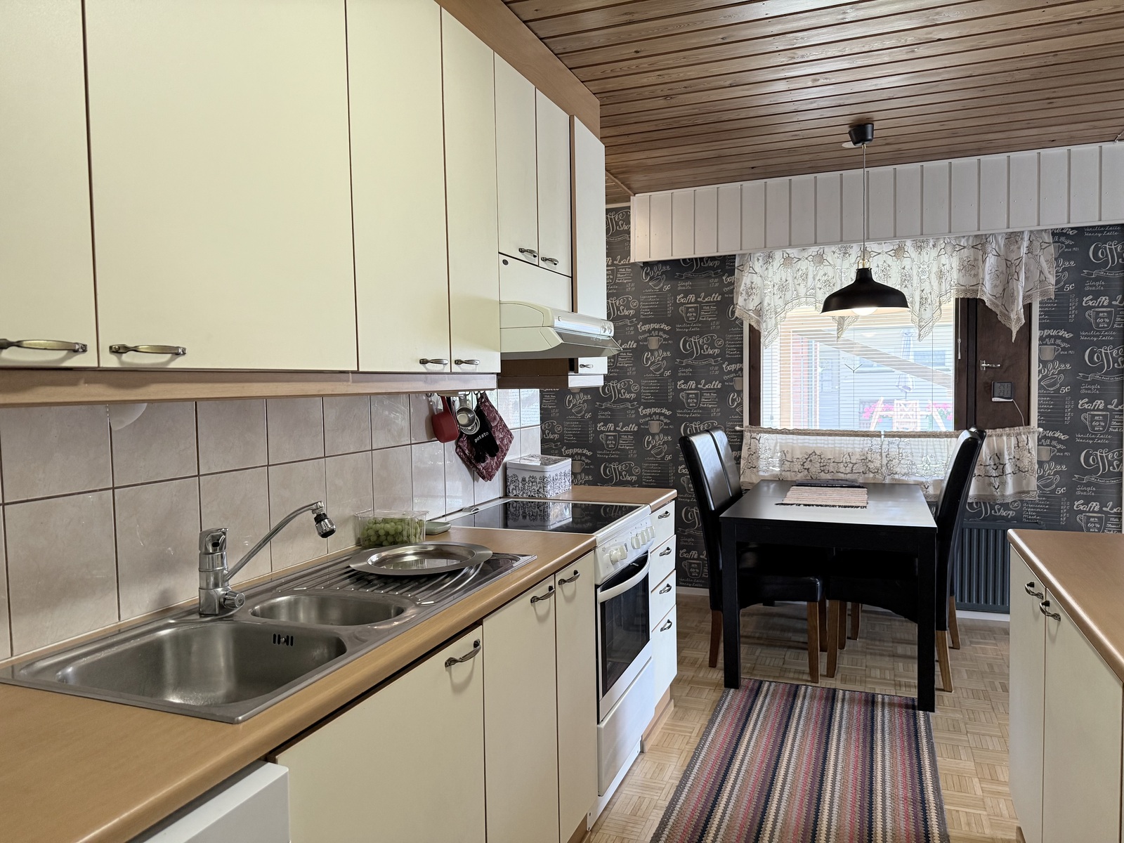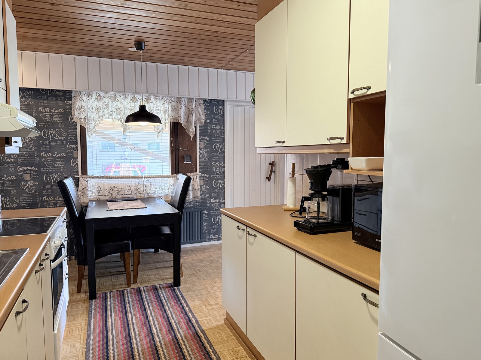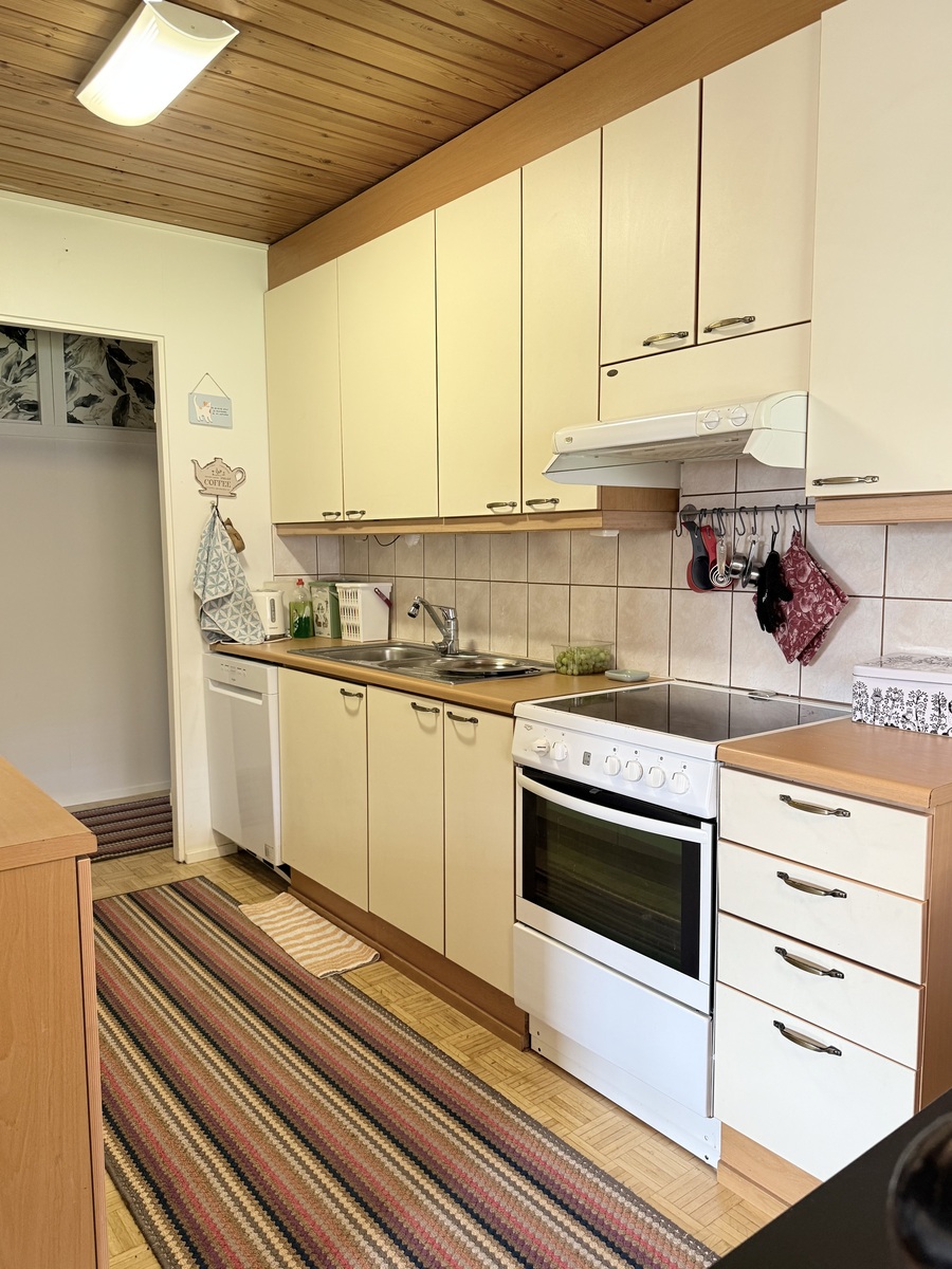 Kuvaus | Yksi keittiön seinistä tapetoitu, muut maalattu. Mosaiikkiparkettilattia. Varusteina: keraaminen liesi, liesituuletin, jääkaappi/pakastin ja astianpesukone. |