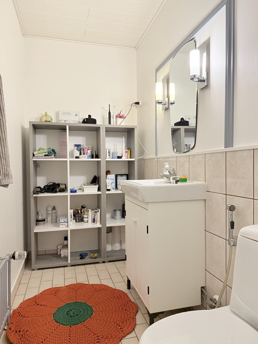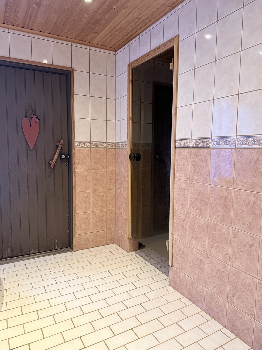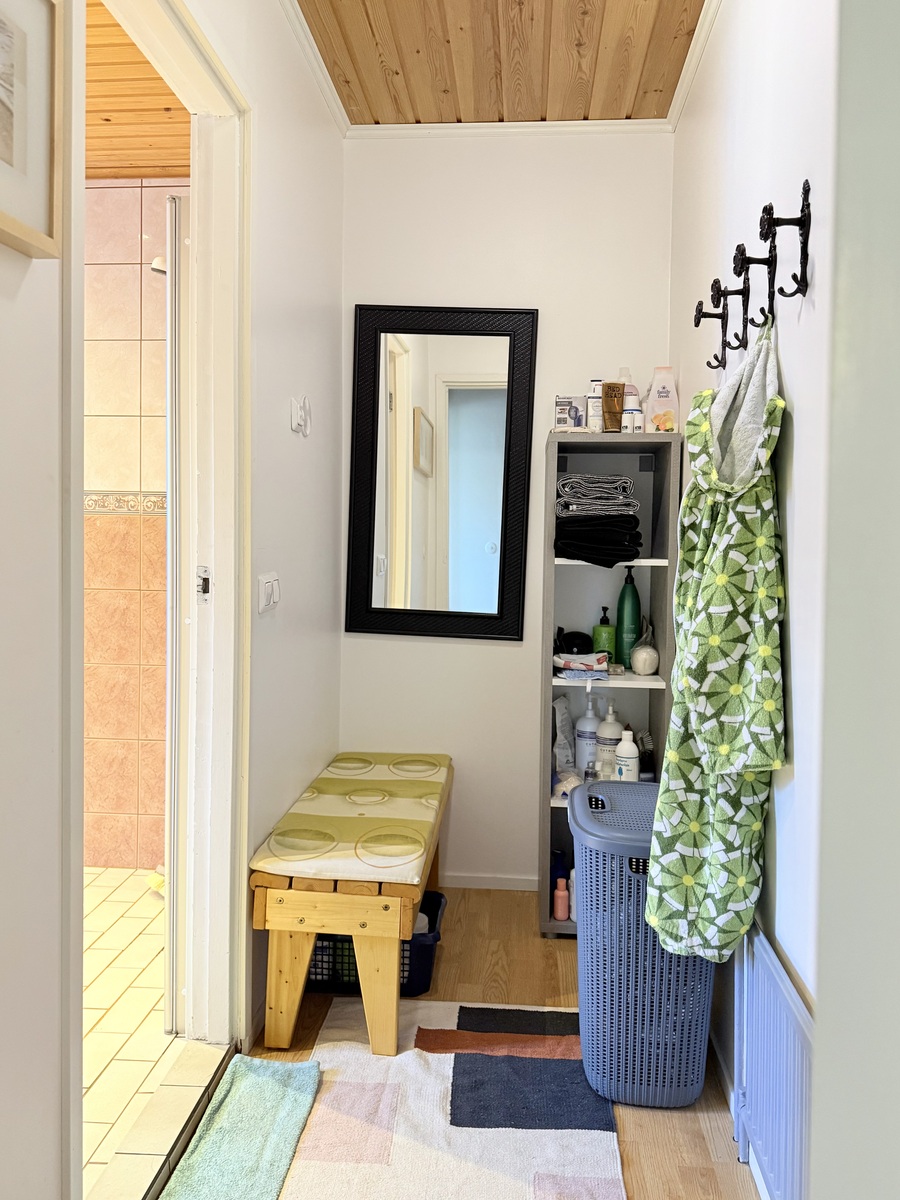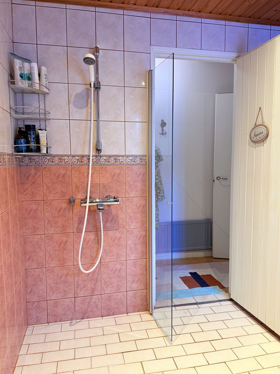 Kuvaus | Kaakeloidut seinät ja laatoitettu lattia. Lattialämmitys (sähköllä) ja vesikiertoinen seinäpatteri. Pk-liitin. Käynti ulos talon päätyyn. |