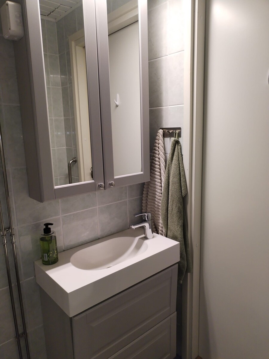Kuvaus Maalatut seinäpinnat ja vinyylilankkulattia. Vaaleanharmaat kaapistot. Varusteina: jääkaappi/pakastin (integroitu, uusittu v.2024), induktiotaso, erillisuuni, liesituuletin, astianpesukone (integroitu). Musta komposiittiallas ja messinkinen hana. Käynti toiselle huoneiston parvekkeista. Keittiö rakennettiin nykyiselle paikalleen v.2018 (entisen keittiön paikalla on nyt makuuhuone).