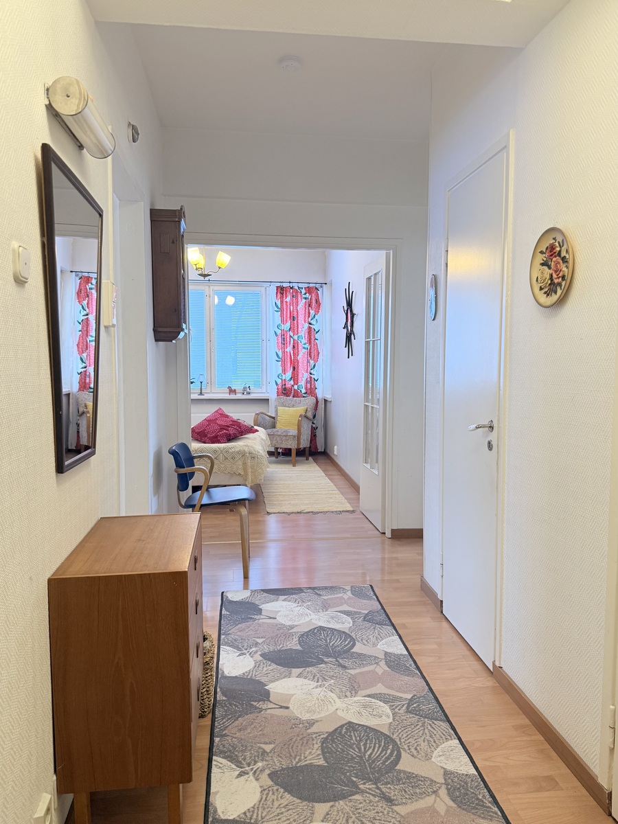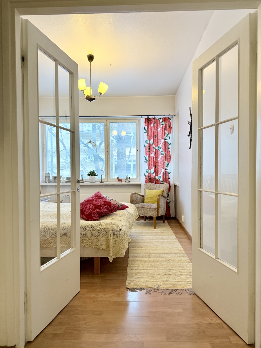Kodikas päätyhuoneisto vuonna 1952 valmistuneen, vankan hissitalon alimmasta kerroksesta. Valoisa läpitalon huoneisto, ikkunoita kolmeen suuntaan. Reilunkokoinen olohuone, josta käynti parvekkeelle. Parilasiovin erotettu ruokailutila, jossa kaunis erkkeri-ikkuna toimii tarvittaessa kolmantena makuuhuoneena. Hoidettu, rauhallinen taloyhtiö. Kohtuullinen hoitovastike (vain 3,60 e/m2). Hyvä sijainti kauniissa puistomaisessa ympäristössä, lähellä kaupungin keskustan palveluja. Vaivatonta kaupunkiasumista parhaimmillaan. Sovi aika esittelyyn ja tule tutustumaan tarkemmin.