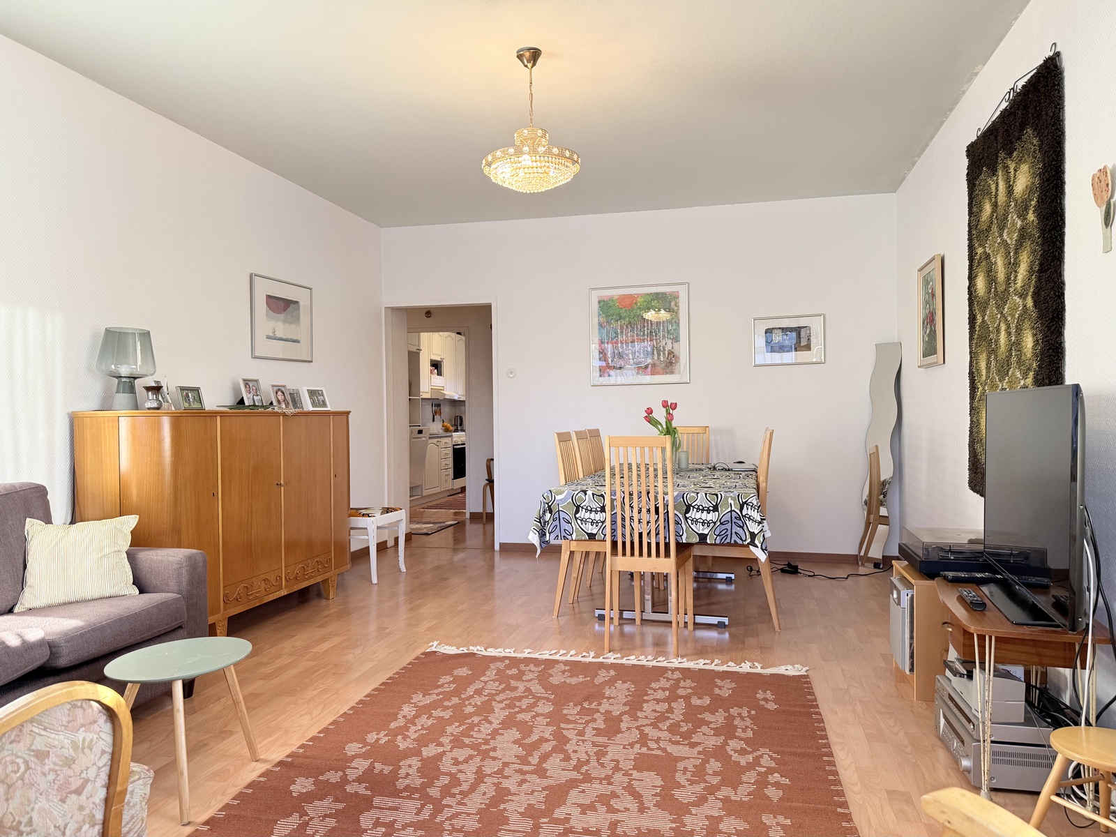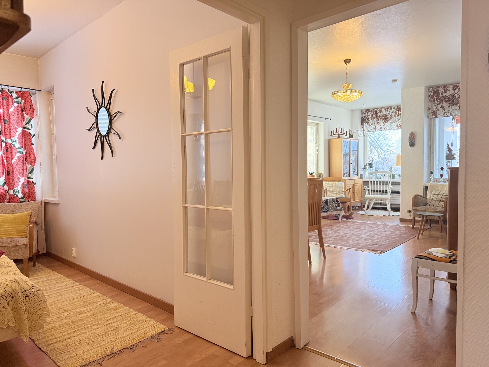 | Kuvaus | Suuri, valoisa olohuone, jossa vaaleat, maalatut seinäpinnat ja laminaattilattia. Käynti parvekkeelle. |