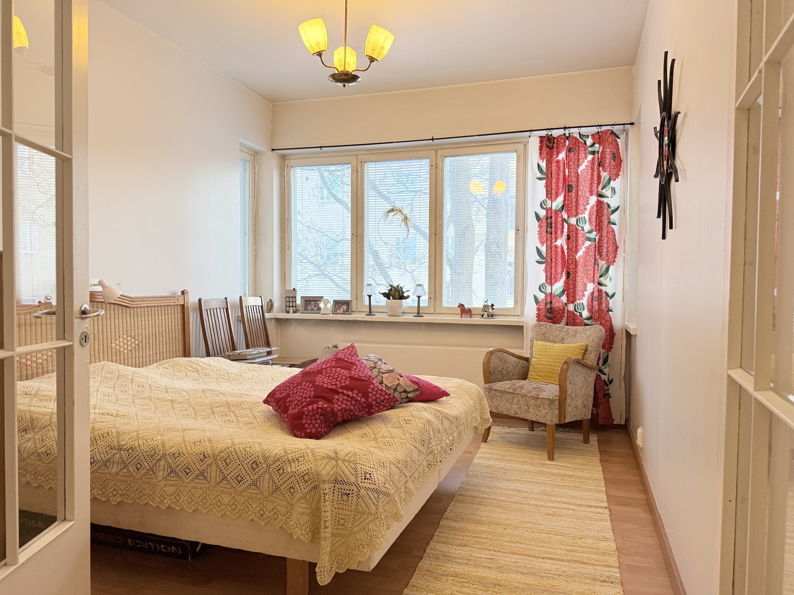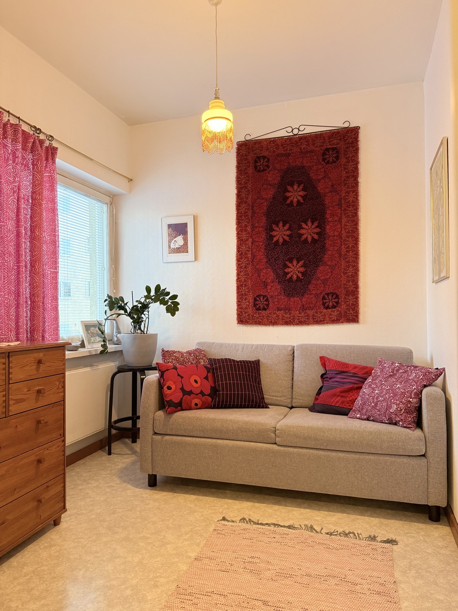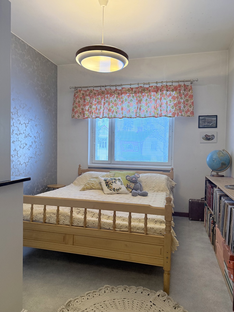 | Kuvaus | Yhdessä makuuhuoneessa tehostetapettiseinä, muut seinät maalattu. Muovimattolattia. Kiinteät komerot (2 kpl). Pienimmässä makuuhuoneessa maalatut seinäpinnat ja muovimattolattia. Kiinteät komerot. Kolmantena makuuhuoneena toimii tarvittaessa pariovin erotettu ruokailutila. |