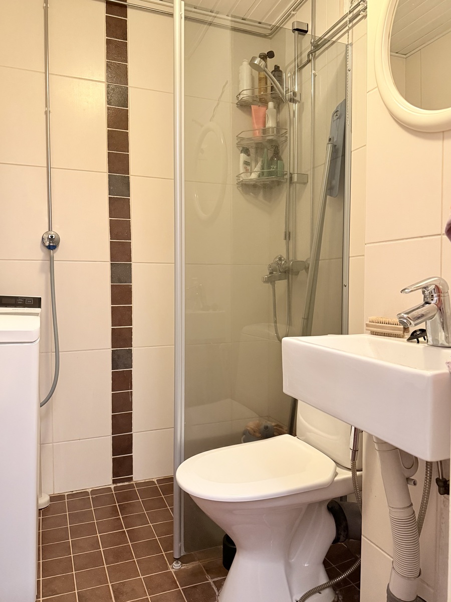 | Kuvaus | Kaakeloidut seinät ja laatoitettu lattia. Lattialämmitys (vesikiertoinen). Suihkuseinä. Pk-liitin. Peilikaappi korvattu väliaikaisesti peilillä (peilikaappi asennetaan takaisin). WC-toiminnot samassa tilassa. Pesuhuone on remontoitu v.2009. |