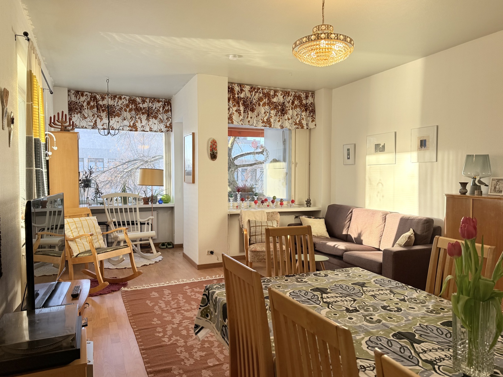 | Tilojen kuvaus | Reilunkokoinen, parilasiovin erotettu ruokailutila, joka toimii loistavasti myös asunnon kolmantena makuuhuoneena. Tässä tilassa on maalatut seinäpinnat ja laminaattilattia. Viehättävät erkkeri-ikkunat. Eteisessä maalatut seinäpinnat ja laminaattilattia. |